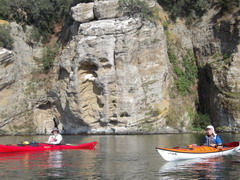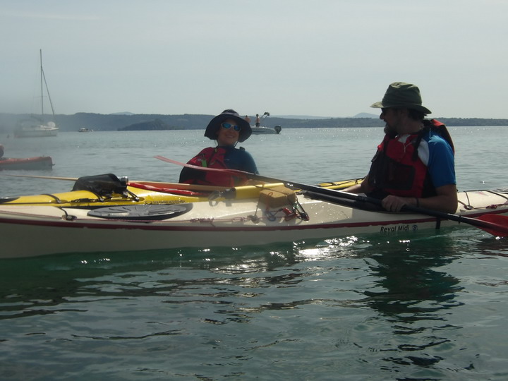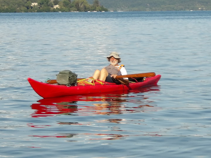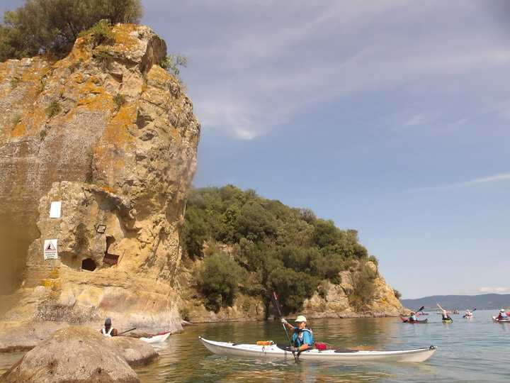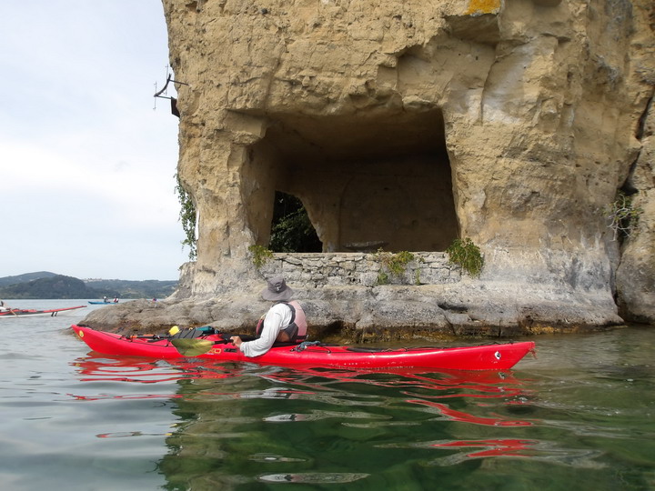 Il giorno dopo, nonostante le fosche previsioni, il vento non è particolarmente fastidioso, quindi ci imbarchiamo ed andiamo di nuovo alla Bisentina, la circumnavighiamo navigando in senso opposto, e poi puntiamo a terra a nord del campeggio, a cui torniamo navigando sempre lungo costa. Alla fine abbiamo percorso 12 km. Il programma canoistico finisce qui per dare la possibilità a chi deve tornare verso Roma di partire presto. Sulla via del ritorno, io Ferdinando e Pina ci godiamo una bella sosta alle terme del Bagnaccio, dove incontriamo un canoista locale che guarda ammirato i nostri kayak sul tetto delle auto e ci chiede informazioni sull’associazione.