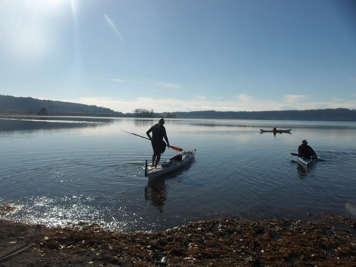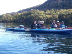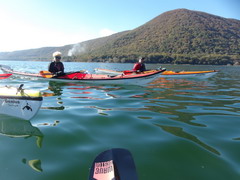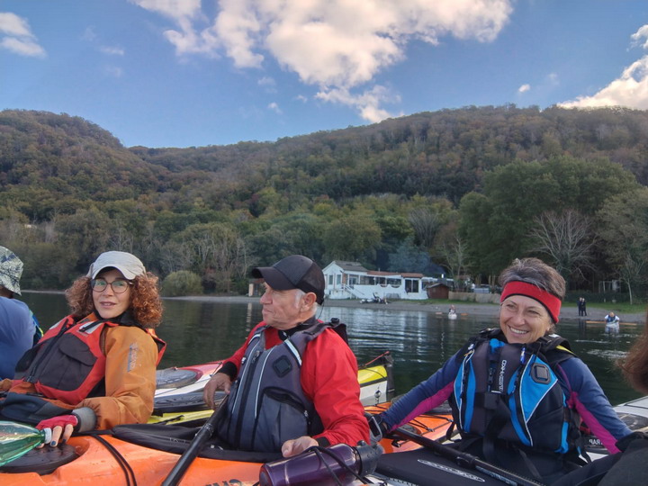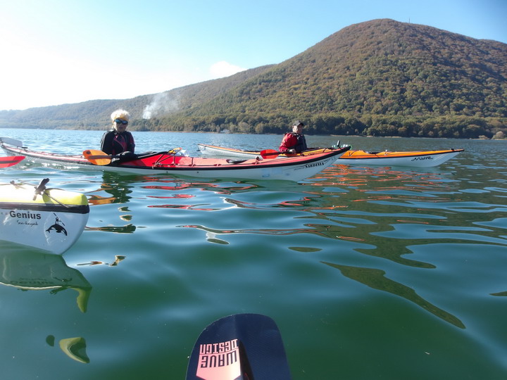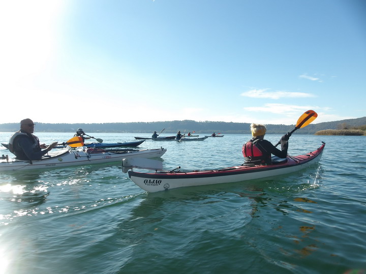 Oggi invece il riscaldamento globale ci ha regalato una giornata quasi primaverile. Appuntamento alle 10 al parcheggio della spiaggia libera vicino al bar/ristorante "La bella Venere" nel territorio di Caprarola. Il tempo di scaricare i kayak e cambiarci e siamo già in acqua. Ci approcciamo al giro in senso antiorario, decisi a farlo ad andatura allegra per non ritardare oltre "il terzo tempo", di cui dirò dopo. Siamo in 8 in acqua: Paola, Marzio (in Sup), Roberta, Stefano Farkas, Valentino e Rossella, Fabrizio e Rossella, Michele. Il paesaggio è arricchito dai colori gialli e rossi dei faggi e dei noccioli. Sull'orizzonte si ergono sopra di noi il monte Venere (m. 835), sul lato opposto il Monte Fogliano (m. 964), entrambi celebri per le faggete che qui vegetano a quote molto più basse che nel resto d'Italia. L’acqua apparentemente è pulita , ma noi sappiamo che purtroppo è inquinata da nitriti e fosfati provenienti da pratiche di agricoltura intensiva dei noccioleti. Di recente una sentenza del Consiglio di Stato ha obbligato la Regione Lazio a prendere provvedimenti per mitigare il fenomeno. Dopo pochi km ci fermiamo per la prima sosta tecnica e perdiamo già di vista Marzio che con la sua tavola ci precede tagliando un po' di insenature. Navighiamo placidi davanti ai canneti e alle postazioni di bird watching incantati dal paesaggio.
