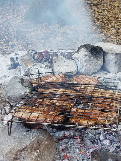 Ci rivestiamo e carichiamo in fretta: abbiamo un appuntamento con Marco I. che stavolta non ha pagaiato, ma ha fatto la spesa e preparato la brace in un area picnic attrezzata con barbecue, nella faggeta alla base del Monte Venere. All'arrivo, oltre all’invitante odorino della carne, salutiamo con affetto anche il maestro Antonio, che è arrivato a sorpresa con famiglia proveniente dalla sua seconda residenza in quel di Nepi. Ha portato anche lui delle salsicce molto apprezzate insieme ad insalata del suo orto. Nel bosco fa veramente freddo, ma noi ci scaldiamo al fuoco della brace e dell'amicizia. Concludiamo con un Brindisi al GCR. con il prosecco portato da Michele e con la crostata di Rossella.