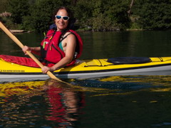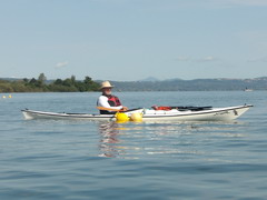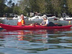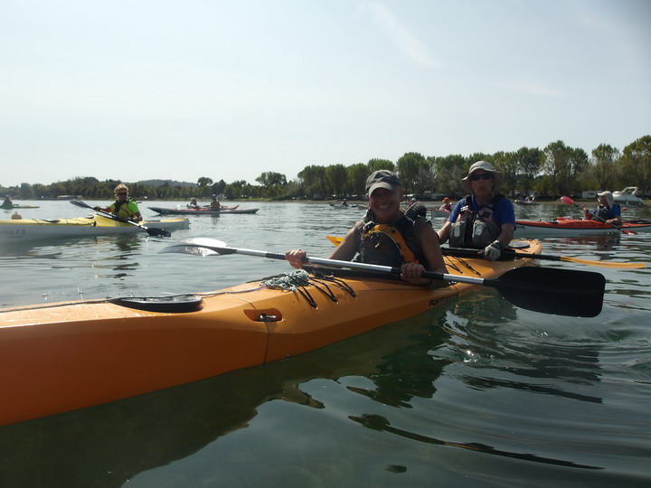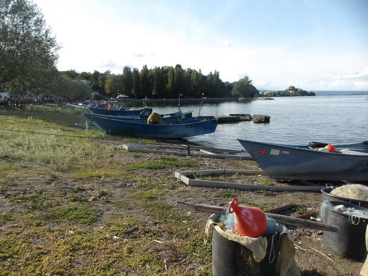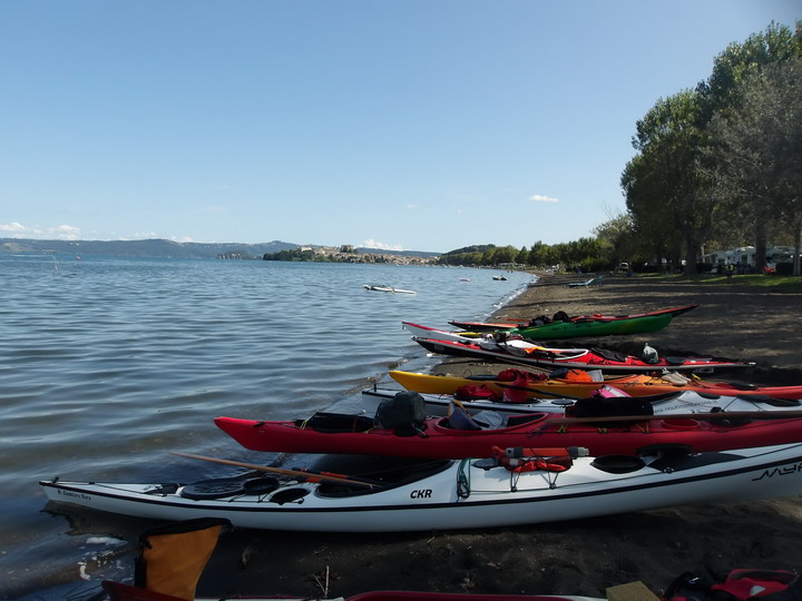 Il giorno dopo, nonostante le fosche previsioni, il vento non è particolarmente fastidioso, quindi ci imbarchiamo ed andiamo di nuovo alla Bisentina, la circumnavighiamo navigando in senso opposto, e poi puntiamo a terra a nord del campeggio, a cui torniamo navigando sempre lungo costa. Alla fine abbiamo percorso 12 km. Il programma canoistico finisce qui per dare la possibilità a chi deve tornare verso Roma di partire presto. Sulla via del ritorno, io Ferdinando e Pina ci godiamo una bella sosta alle terme del Bagnaccio, dove incontriamo un canoista locale che guarda ammirato i nostri kayak sul tetto delle auto e ci chiede informazioni sull’associazione.