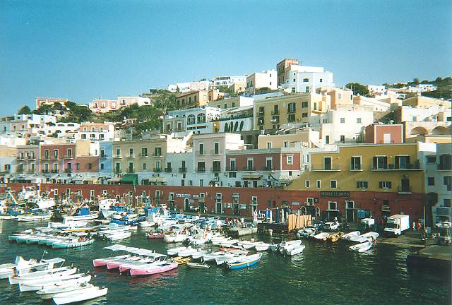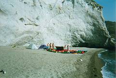 Dopo un paio d’ore eccoci di nuovo in canoa: dobbiamo accompagnare al porto Eugenio che deve imbarcarsi sul traghetto per rientrare a Roma in serata e non potrà essere con noi per il periplo dell’isola previsto per l’indomani. In paese possiamo notare un grande interesse per le nostre canoe: è infatti la prima volta che le polinesiane arrivano a Ponza e l’accoglienza è festosa e incuriosita da parte di molte persone. Salutiamo Eugenio un po’ rammaricati anche perché rimarremo solo in sette per il lungo giro del giorno dopo e gironzoliamo per il paese. Dopo cena una graditissima sorpresa: incontriamo Andrea, della squadra di canoa polo del GCR, in vacanza a Ponza. E’ "l’uomo della provvidenza": verrà con noi domani a completare l’equipaggio per il giro dell’isola. Noi torniamo al Frontone, montiamo le tende, dormiamo come sassi.