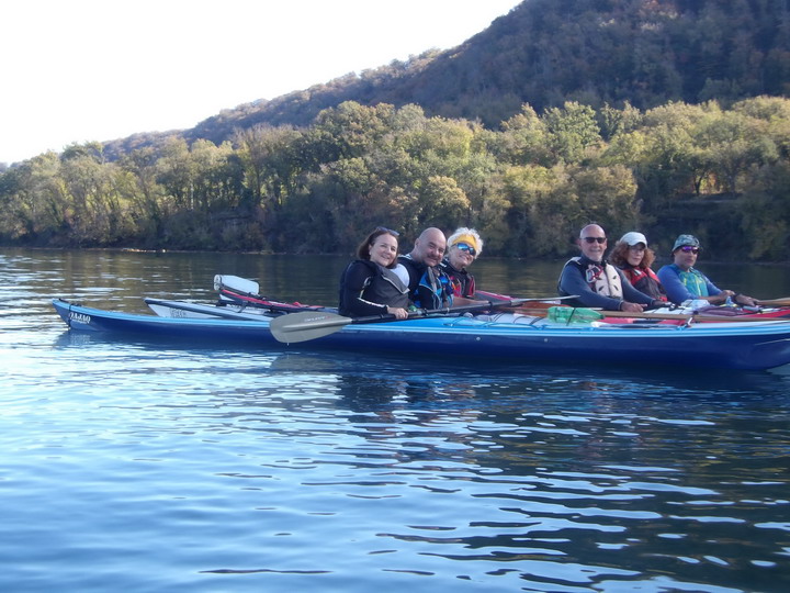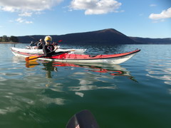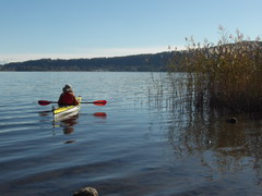 Oggi invece il riscaldamento globale ci ha regalato una giornata quasi primaverile. Appuntamento alle 10 al parcheggio della spiaggia libera vicino al bar/ristorante "La bella Venere" nel territorio di Caprarola. Il tempo di scaricare i kayak e cambiarci e siamo già in acqua. Ci approcciamo al giro in senso antiorario, decisi a farlo ad andatura allegra per non ritardare oltre "il terzo tempo", di cui dirò dopo. Siamo in 8 in acqua: Paola, Marzio (in Sup), Roberta, Stefano Farkas, Valentino e Rossella, Fabrizio e Rossella, Michele. Il paesaggio è arricchito dai colori gialli e rossi dei faggi e dei noccioli. Sull'orizzonte si ergono sopra di noi il monte Venere (m. 835), sul lato opposto il Monte Fogliano (m. 964), entrambi celebri per le faggete che qui vegetano a quote molto più basse che nel resto d'Italia. L’acqua apparentemente è pulita , ma noi sappiamo che purtroppo è inquinata da nitriti e fosfati provenienti da pratiche di agricoltura intensiva dei noccioleti. Di recente una sentenza del Consiglio di Stato ha obbligato la Regione Lazio a prendere provvedimenti per mitigare il fenomeno. Dopo pochi km ci fermiamo per la prima sosta tecnica e perdiamo già di vista Marzio che con la sua tavola ci precede tagliando un po' di insenature. Navighiamo placidi davanti ai canneti e alle postazioni di bird watching incantati dal paesaggio.