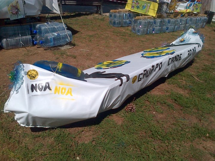 Fra i tanti bambinoni siamo i più professionali sul cantiere. Il Progetto viene modificato almeno tre volte al riparo dello striscione del Gruppo Canoe Roma steso fra una quadriglia di pallets. Lo spazio del cantiere è iper affollato di gente che lavora febbrilmente anche al limite del buio. Una rapida occhiata e comprendiamo che fra i tanti abbiamo la barca più veloce a cui il Capitano e l’Architetto danno il nome: NOA-NOA del Gruppo Canoe Roma. Fondamentali per la realizzazione della struttura il Cicloperaio e Turiddu che fra una sigaretta e l’altra propone continuamente affinamenti. Attribuisco a lui, Marco e il Capitano la modifica più importante: una terza fila di boccioni a sezione quadrata per realizzare una sorta di chiglia. Col senno del poi ci svantaggerà,… ma è tanto bella!