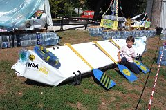 Si parte e si decide che si costruirà il tutto al Cantiere della Città in Tasca, poi per il trasporto si vedrà. Appena arrivati si comprende che i boccioni da 25 litri ce li hanno tutti, visto che sono messi a disposizione dall’organizzazione, che fornisce pallets, legname più o meno usurato, teli in PVC da buttare e materiale plastico di vario genere. Capiamo subito che il nostro vantaggio competitivo non c’è, toccherà fare una barca che va più veloce. Si sprecano i consigli con gli altri e gli aiuti (scusa ce l’hai una pinza? E un martello? Qualche cordino?) E’ la Fiera bellissima dell’improvvisazione, famiglie intere che si cimentano in improbabili meccanismi a ruota ed elastici. Remi di tre metri che poi vengono drasticamente ridotti, tolde di navi poggianti su 40-50, forse 70 boccioni. Molti tagliano e inchiodano, noi no solo legaggi con filo riciclabile e gomma da camera d’aria.