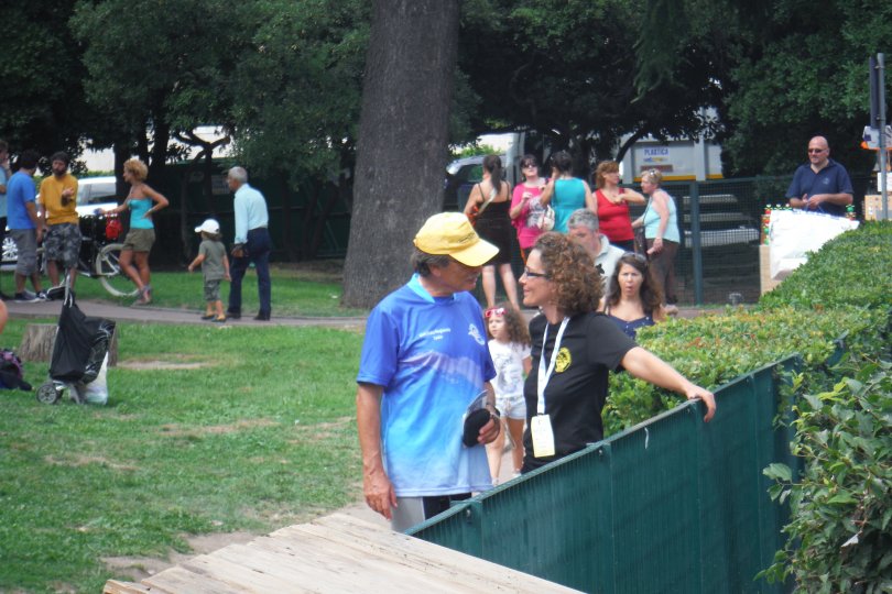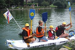 Sabato 7 finalmente il varo e la prova in acqua. Il Capitano scalpita. Scorrendo le varie pittoresche imbarcazioni poggiate sul pontile finale del Laghetto dell’EUR, affianco ad un’altra splendida polinesiana realizzata con una vasca da bagno e vari profilati di cantiere, scopro uno strano oggetto di oltre 5 metri (il regolamento prevedeva la lunghezza massima a 4,5metri) fatto con due file di boccioni appena distanziati da una scala in alluminio nuova nuova e soprattutto ricoperti da un foglio di pvc trasparente che azzera l’attrito della rugosità dei boccioni. Subito ribattezzato “IL SILURO”. Abbiamo perso! La barca andrebbe squalificata, poi vedo l’equipaggio e no… non si può fare. Ce la metteremo tutta comunque per arrivare primi. Abbiamo deciso che l’equipaggio sarà femminile: Pina e Roberta, però Pina sabato non può venire alle prove e ci giochiamo tutto Domenica.